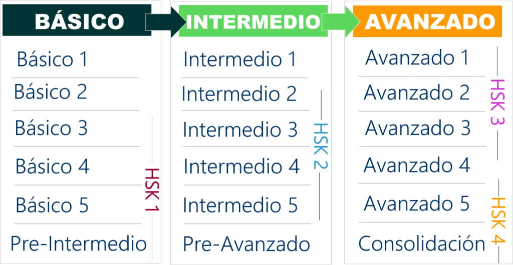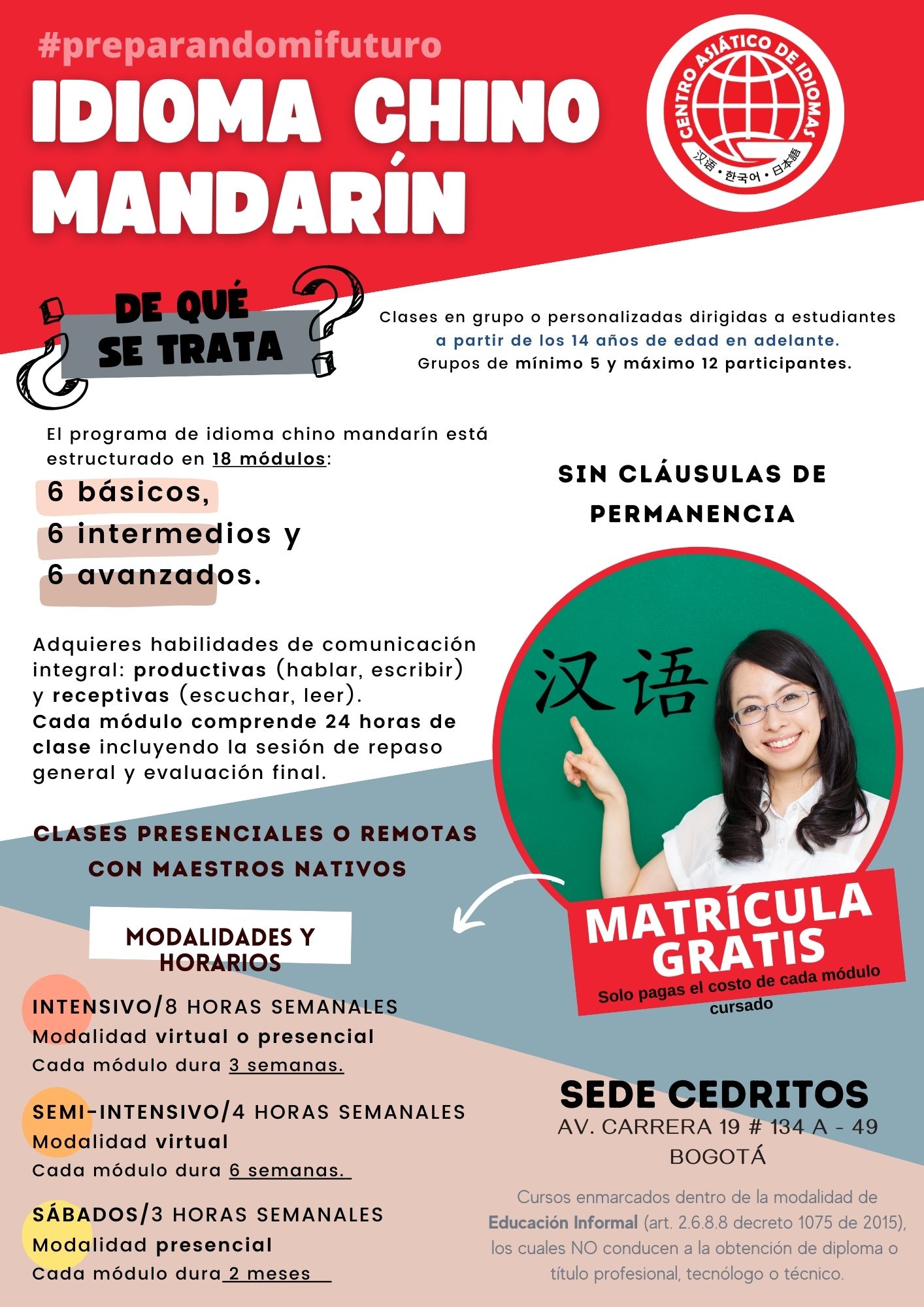 * El curso de idioma CHINO MANDARÍN se estructura en 18 módulos (6 BÁSICOS + 6 INTERMEDIOS + 6 AVANZADOS). Cada módulo comprende veinticuatro (24) horas de clase. Total: 432 horas de clases. No hay claúsulas de permanencia. Puedes cursar la cantidad de módulos que necesites.